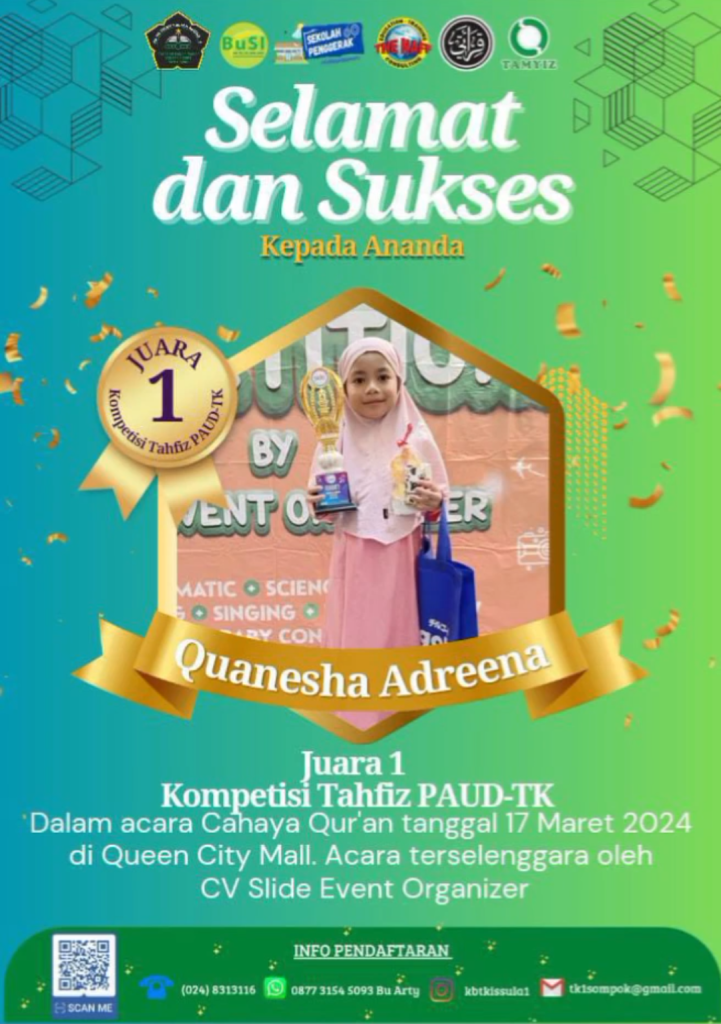 Diraih Oleh : Quanesha Adreena dalam acara Cahaya Qur’an Tanggal 17 Maret 2024 di Queen City Mall. Acara terselenggara Oleh CV Slide Event Organizer